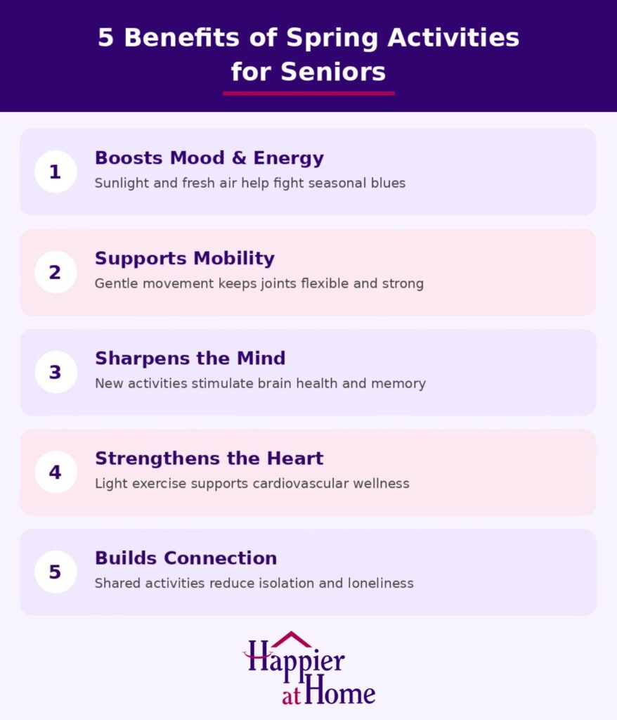 After months of cold weather and shorter days, spring brings a welcome change. Warmer temperatures make outdoor activities more comfortable, and longer daylight hours create more time to enjoy them. These simple shifts in the environment can have a big impact on how seniors feel day to day.
